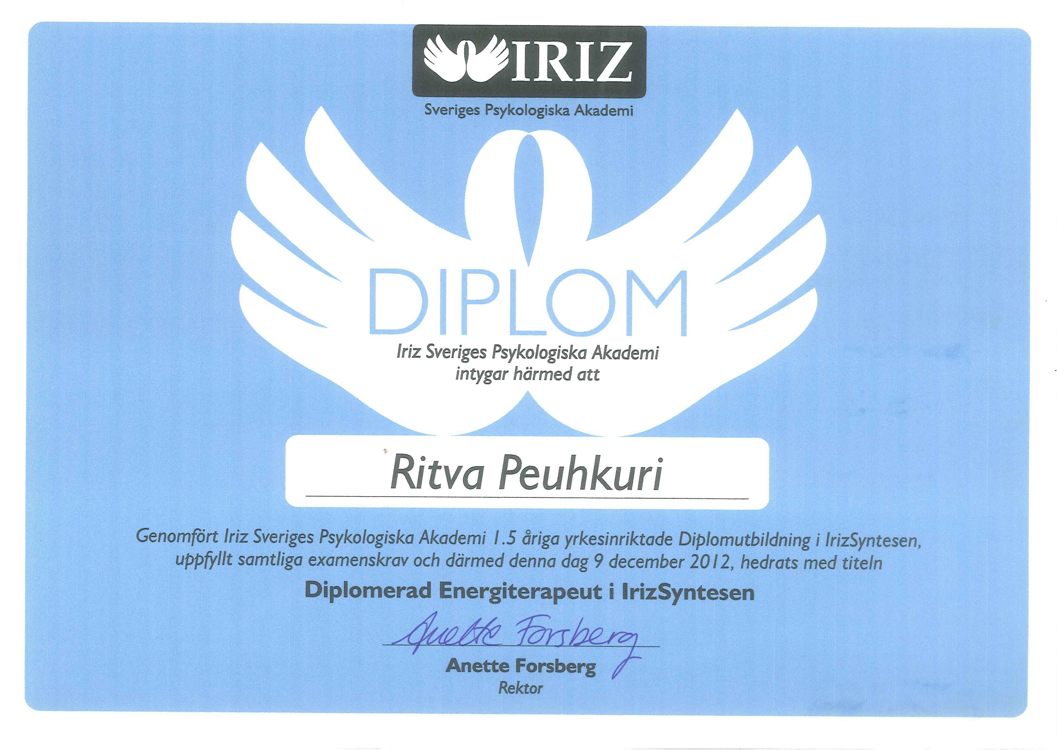 Jag är diplomerad energiterapeut genom att ha gått en tre terminer lång utbildning på Iriz Akademin i Göteborg. Nedan finns en länk till mitt diplom i IrizSyntesen.